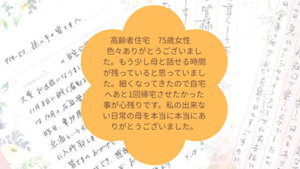 これまでにご利用者様・ご家族様・ケアマネジャー様よりお寄せいただいたお便りの一部をご紹介いたします。 「ありがとう」の声が私たちの心に花を咲かせてくださいます。 今回ご紹介したお手紙以外にも、たくさんの温かいお声をお寄せ […]